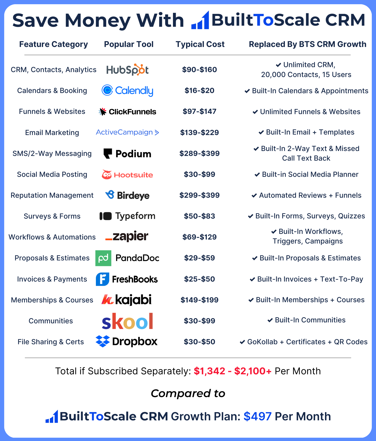 Other CRMs only manage contacts. BuiltToScale CRM goes far beyond that with built-in funnels and website builders, online courses and communities, an internal product catalog, invoicing, reputation management, and more.